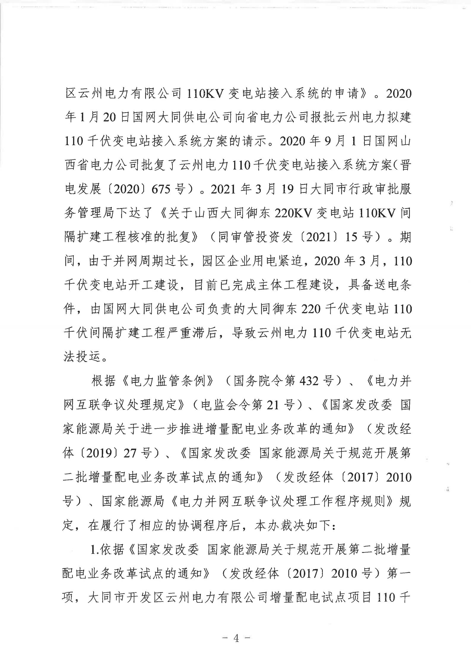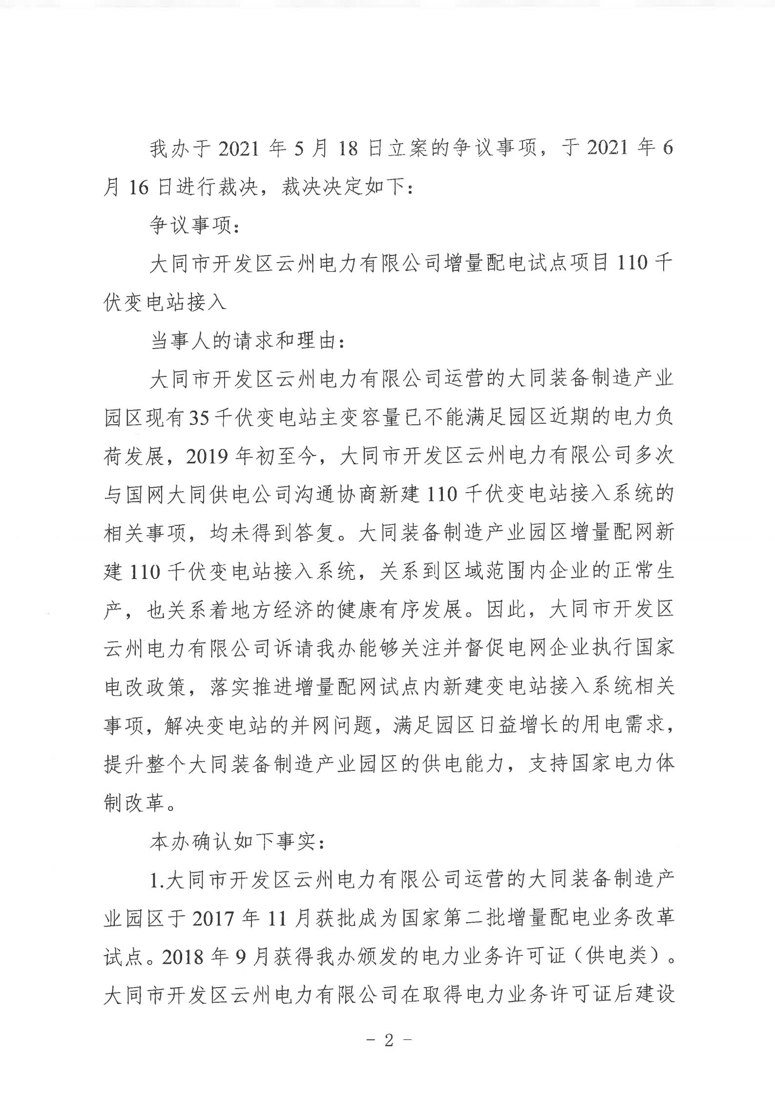 山西能監(jiān)辦近日發(fā)布行政裁決書(晉監(jiān)能裁決【2021】1號(hào)),裁決書顯示,山西能監(jiān)辦于2021年5月18日立案爭(zhēng)議事項(xiàng),于2021年6月16日進(jìn)行裁決。爭(zhēng)議事項(xiàng)為大同市開發(fā)區(qū)云州電力有限公增量配電試點(diǎn)項(xiàng)目110千伏變電站接入。 當(dāng)事人的請(qǐng)求和理由:大同市開發(fā)區(qū)云州電力有限公司運(yùn)營(yíng)的大同裝備制造產(chǎn)業(yè)園區(qū)現(xiàn)有35千伏變電站主變?nèi)萘恳巡荒軡M足園區(qū)近期的電力負(fù)荷發(fā)展,2019年初至今,大同市開發(fā)區(qū)云州電力有限公司多次與國(guó)網(wǎng)大同供電公司溝通協(xié)商新建110千伏變電站接入系統(tǒng)的相關(guān)事項(xiàng),均未得到答復(fù)。大同市開發(fā)區(qū)云州電力有限公司訴請(qǐng)山西能監(jiān)辦能夠關(guān)注并督促電網(wǎng)企業(yè)執(zhí)行國(guó)家電改政策,落實(shí)推進(jìn)增量配網(wǎng)試點(diǎn)內(nèi)新建變電站接入系統(tǒng)相關(guān)事項(xiàng),解決變電站的并網(wǎng)問(wèn)題,滿足園區(qū)日益增長(zhǎng)的用電需求,提升整個(gè)大同裝備制造產(chǎn)業(yè)園區(qū)的供電能力。 山西能監(jiān)辦裁決: 大同市開發(fā)區(qū)云州電力有限公司增量配電試點(diǎn)項(xiàng)目110千伏變電站已經(jīng)納入山西省相關(guān)電網(wǎng)規(guī)劃,項(xiàng)目已獲備案,且在備案有效期內(nèi)開工建設(shè),屬于合法合規(guī)的增量配電業(yè)務(wù),應(yīng)予支持。 大同市開發(fā)區(qū)云州電力有限公司擁有增量配網(wǎng)試點(diǎn)區(qū)域內(nèi)與電網(wǎng)企業(yè)相同的權(quán)利與義務(wù),享有公平接入電網(wǎng)的權(quán)利。 國(guó)網(wǎng)大同供電公司應(yīng)當(dāng)履行公平接入義務(wù),不得拒絕和拖延。國(guó)網(wǎng)大同供電公司應(yīng)在2021年10月1日前完成110千伏變電站并網(wǎng)送電。 以下為原文: