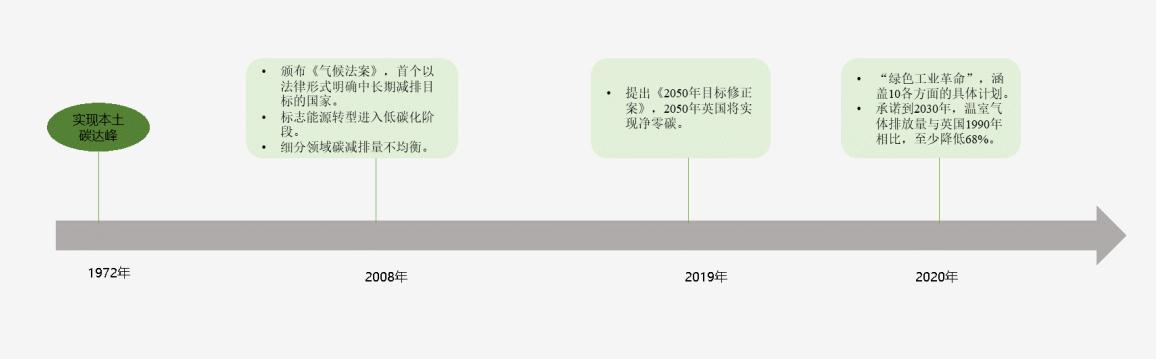 報(bào)告圍繞中國(guó)應(yīng)對(duì)氣候變化的政策措施、歐美日主要國(guó)家的典型做法、中國(guó)“碳達(dá)峰、碳中和”現(xiàn)狀及實(shí)施路徑等方面進(jìn)行深度分析,重點(diǎn)在電力行業(yè)、工業(yè)行業(yè)、交通運(yùn)輸行業(yè)、建筑行業(yè)展開專題研究,共同探討各地方政府實(shí)現(xiàn)“雙碳”目標(biāo)的行動(dòng)方案,以期為地方政府決策及業(yè)界參考提供智力支撐,助力我國(guó)“碳達(dá)峰、碳中和”目標(biāo)的實(shí)現(xiàn)。 1.碳達(dá)峰發(fā)展階段 在應(yīng)對(duì)全球氣候變化、實(shí)現(xiàn)碳中和目標(biāo)上,英國(guó)通過一系列的承諾和改革舉措,在該領(lǐng)域保持世界領(lǐng)先地位。 英國(guó)早在1972年就已經(jīng)實(shí)現(xiàn)本土碳達(dá)峰,2008年正式頒布《氣候變化法》,確定了到2050年將溫室氣體排放量比1990年減少80%的長(zhǎng)期減排目標(biāo),成為世界上首個(gè)以法律形式明確中長(zhǎng)期減排目標(biāo)的國(guó)家。在法案通過后的10年間,英國(guó)溫室氣體減排初具成效,2018年比2008年下降了30%。 2019年6月,英國(guó)提出了《2050年目標(biāo)修正案》,正式確立到2050年實(shí)現(xiàn)溫室氣體“凈零排放”。 2020年11月宣布一項(xiàng)涵蓋10個(gè)方面的“綠色工業(yè)革命”計(jì)劃,包括大力發(fā)展海上風(fēng)能、推進(jìn)新一代核能研發(fā)和加速推廣電動(dòng)車等。 2020年12月宣布最新減排目標(biāo),承諾到2030年英國(guó)溫室氣體排放量與1990年相比,至少降低68%。