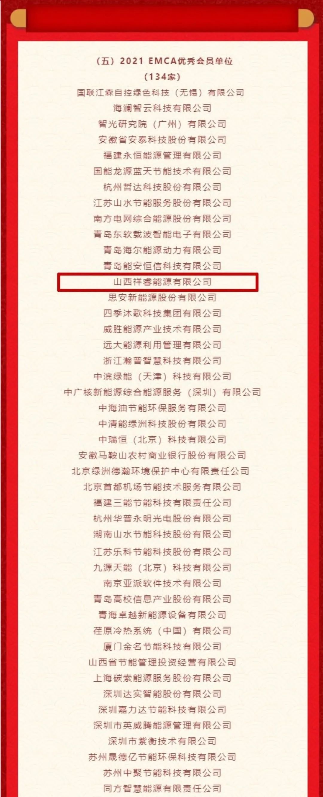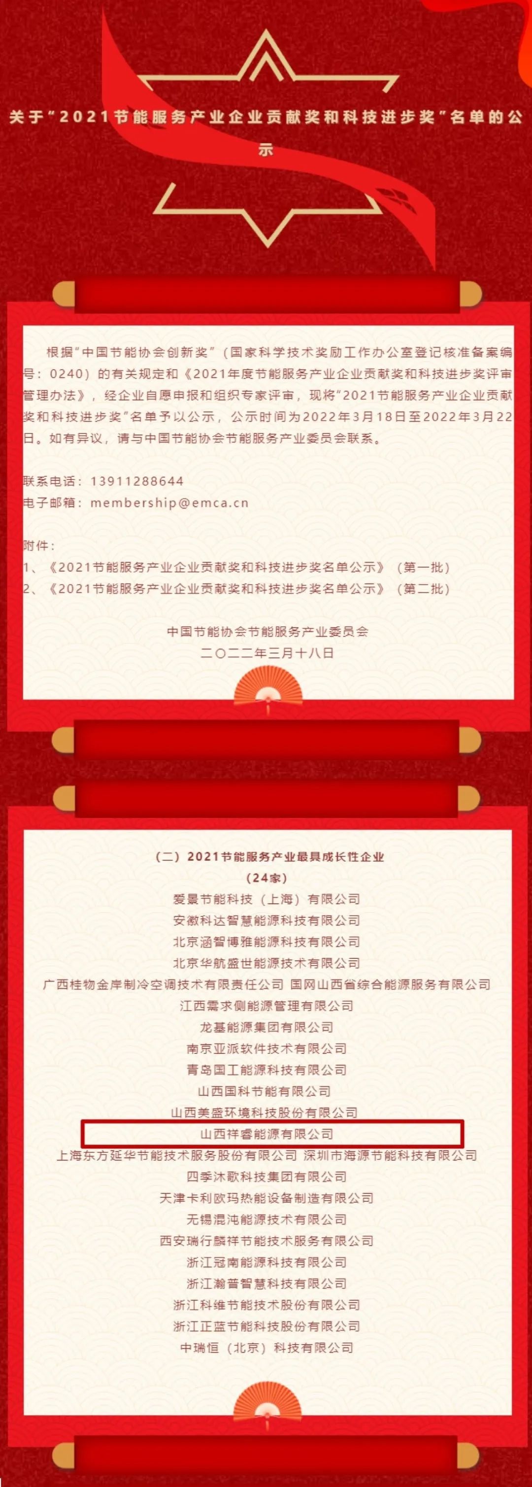 3月18日,中國節(jié)能協(xié)會節(jié)能服務產(chǎn)業(yè)委員會發(fā)布了關于《2021節(jié)能服務產(chǎn)業(yè)企業(yè)貢獻獎和科技進步獎名單的公示》。山西祥睿能源有限公司榮登榜單,入選“2021年節(jié)能服務產(chǎn)業(yè)最具成長性企業(yè)”和“2021EMCA優(yōu)秀會員單位”稱號。
