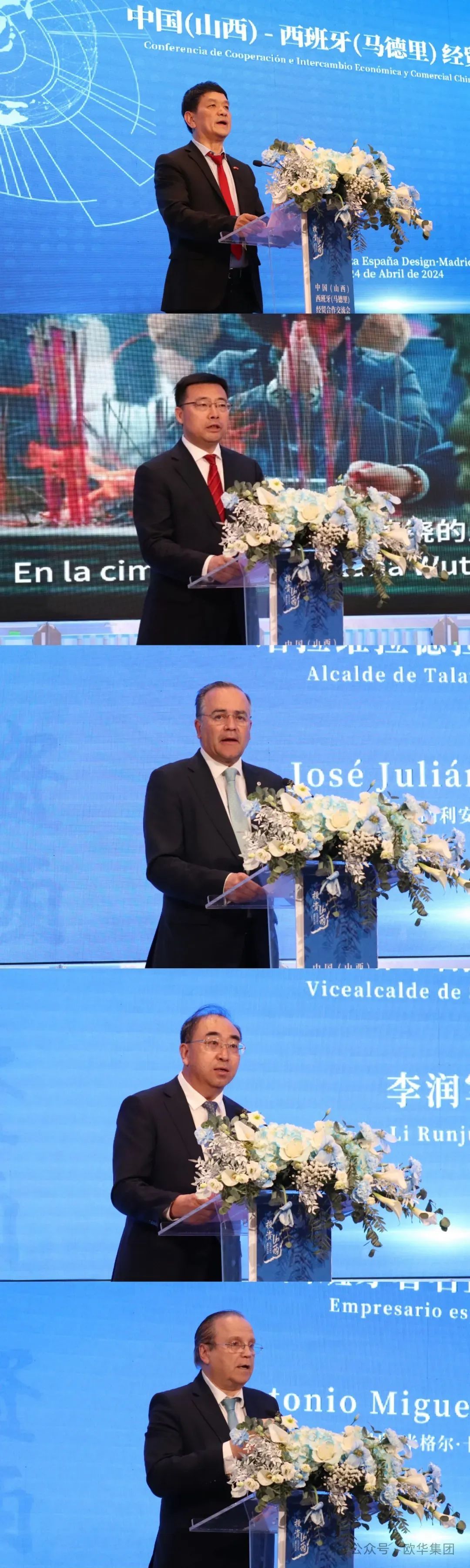 西班牙中華總商會會長陳蘇忠,山西省工商聯(lián)常務(wù)副主席陳旭忠,塔拉維拉德拉雷納市市長何塞·胡利安·格雷戈里奧,朔州市副市長李潤軍,以及西班牙著名企業(yè)家安東尼奧·米格爾·卡爾莫納分別發(fā)言。