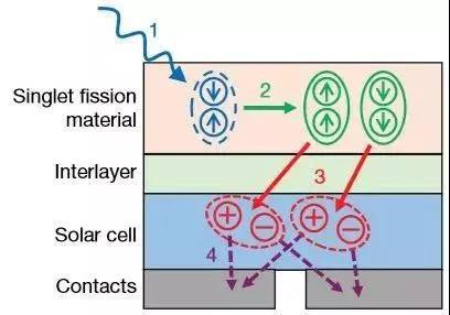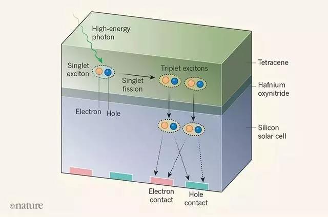 在太陽能電池中,光子激發(fā)材料分子釋放電子,產生電流。通常一個光子只能激發(fā)出一個電子,高能光子的剩余能量會以熱量的形式散失。 此前人們發(fā)現,在并四苯等某些有機材料里,一個分子吸收一個高能光子后,可將部分能量轉移給另一個分子,最終產生兩個電子,這種現象稱為“單線態(tài)激子裂變”。理論上,在硅電池上覆蓋一層并四苯,就能用一個高能光子獲得兩個電子,但如何讓“單線態(tài)激子裂變”產生的兩個電子轉移到硅材料中是一個關鍵難題。 為了保證電池效率和耐久性,硅材料必須有表面鈍化層。并四苯中產生的電子必須穿過鈍化層,才能到達硅材料。相對于電子轉移能力來說,目前的鈍化層都太厚了。 新方案的關鍵是用氮氧化鉿對硅材料進行鈍化,得到的鈍化層厚度僅0.8納米(1納米等于十億分之一米),可容許更多電子通過。研究表明,并四苯每吸收一個光子,平均有1.3個電子可穿過氮氧化鉿鈍化層,轉移到硅材料里。研究人員說,新電池效率遠未達到理論極限,尚需改進,但試驗證明了其中的關鍵步驟行之有效。該方案沒有引入復雜的設計,而且可能使電池總體上更薄。 |
