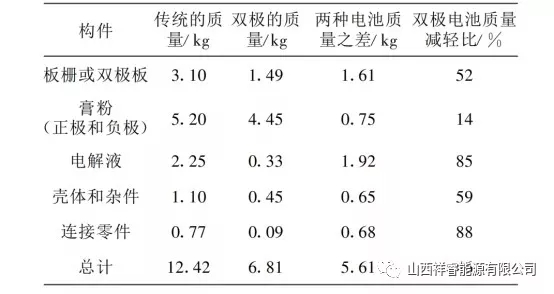 目前,除了動力鋰電池外,我國動力蓄電池的需求量增長也很明朗。隨著電動汽車的發(fā)展,與其配套的鉛酸蓄電池也得到了相應(yīng)的發(fā)展。蓄電池的使用壽命是制約著電動汽車發(fā)展的重要因素之一,所以,提高鉛蓄電池的使用壽命至關(guān)重要。影響鉛酸蓄電池使用壽命的因素主要包括,與之相配套的充電器、自身質(zhì)量、用戶使用方式是否正確等。 提高蓄電池質(zhì)量,可以從鉛膏及固化入手,鉛膏添加劑是從事鉛酸電池研究的人員長期研究的內(nèi)容之一,鉛膏主要作用是改善正極的導(dǎo)電性能,增加正極的孔率,改善負(fù)極充電接受能力和防止極板的硫鹽化。多數(shù)充電器在指示燈變燈指示充滿電以后,電池充入電量可能是97%~99%。雖然僅欠充電1%~3%的電量,對續(xù)行能力的影響幾乎可以忽略,但是也會形成欠充電積,所以電池充滿電變燈以后還是盡可能繼續(xù)進(jìn)行浮充電,這樣對抑制電池硫化也是有好處的。 目前,除了動力鋰電池外,我國動力蓄電池的需求量增長也很明朗。電動汽車所用的動力鉛酸蓄電池種類多樣化,包括雙極性鉛酸蓄電池、水平鉛酸蓄電池,以及卷式電池等。雙極性密封鉛酸蓄電池最早是由美國Arias公司開發(fā)的,是一面有正極活性物質(zhì),另一面有負(fù)極活性物質(zhì)的堅(jiān)實(shí)薄片極板的電池,具有較高的比能量。 普通鉛酸電池的極板是豎立著放置的,而雙極性鉛酸蓄電池的電極是平臥著放置的。電極水平臥著放置是為了防止電解液層化,和活性物質(zhì)剝離,以及便于采用輕量薄形電極基片。通過采用雙極性結(jié)構(gòu),大大減輕了鉛酸電池的質(zhì)量,提高了設(shè)計(jì)效率。如表1,是對傳統(tǒng)的12V12Ah鉛酸電池與雙極性24V12Ah鉛酸電池零件分解質(zhì)量的比較。