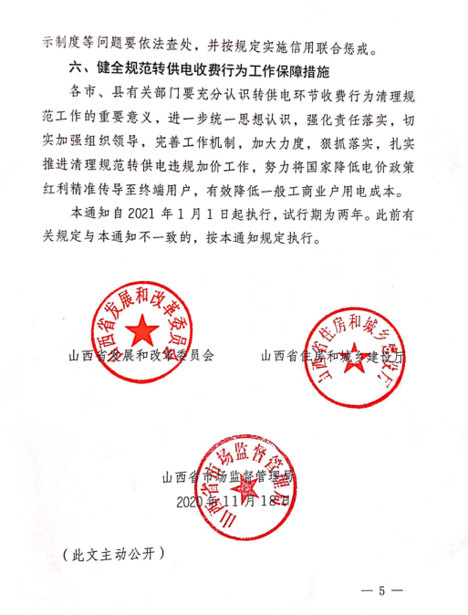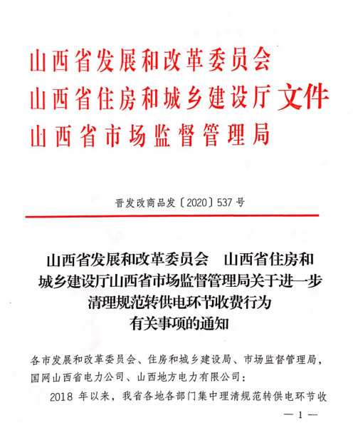 山西省發(fā)改委、住建廳、市場監(jiān)管局聯(lián)合印發(fā)通知,決定進一步清理規(guī)范轉(zhuǎn)供電環(huán)節(jié)收費行為,減輕企業(yè)負擔。2018年以來,根據(jù)國家發(fā)改委統(tǒng)一部署,山西省價格主管部門共五次降低一般工商業(yè)電價,累計降價金額每千瓦時13.26分。今年以來,為應對疫情影響,自2月1日起至12月31日,山西省降低除高耗能行業(yè)用戶外的現(xiàn)執(zhí)行一般工商業(yè)及其他電價、大工業(yè)電價的電力用戶電費,統(tǒng)一按原到戶電價水平的95%結(jié)算。 通知要求,各轉(zhuǎn)供電主體要嚴格按照國家和山西省出臺的電價降價及優(yōu)惠政策,開展收取電費行為的自查自糾。尚未將降價政策紅利傳導至終端用戶的,限于2020年12月31日前將降價政策紅利傳導至每一位終端用戶,不得截留。詳情如下: